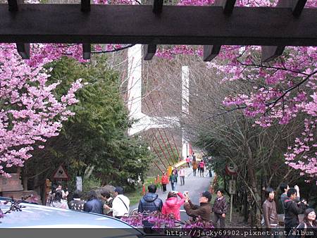 雖然今天是平常日,但櫻花正盛開,車潮也很多,所以還是塞了2.5小時。塞車的主要原因是有些路段路面非常狹窄,只勉強夠一輛大型遊覽車通過,由於大小車一輛接一輛,當兩輛大型遊覽車狹路相逢,後面又接一排的小型車塞住時,「喬車」是造成塞車的主因。