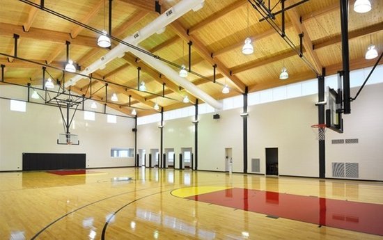 這個娛槳設施位於主宅的附屬部分,擁有一個舖了硬木地板的標準規格籃球場,還有可調節的支架、籃筐,“達到比賽水準”的灯光和音響系統。